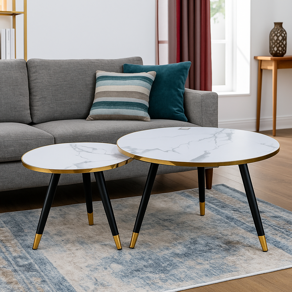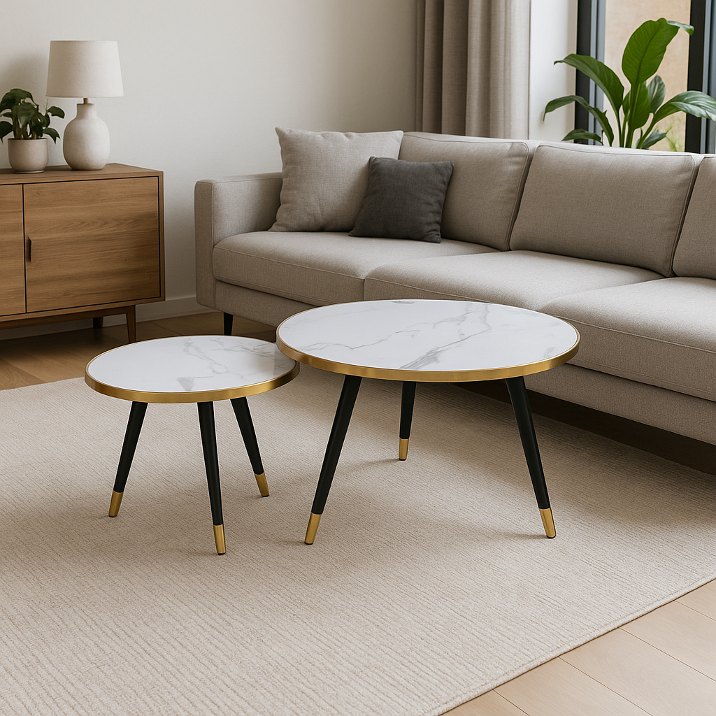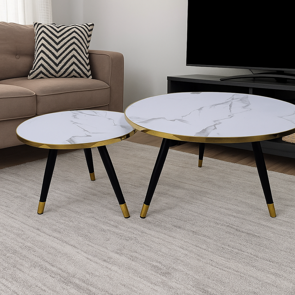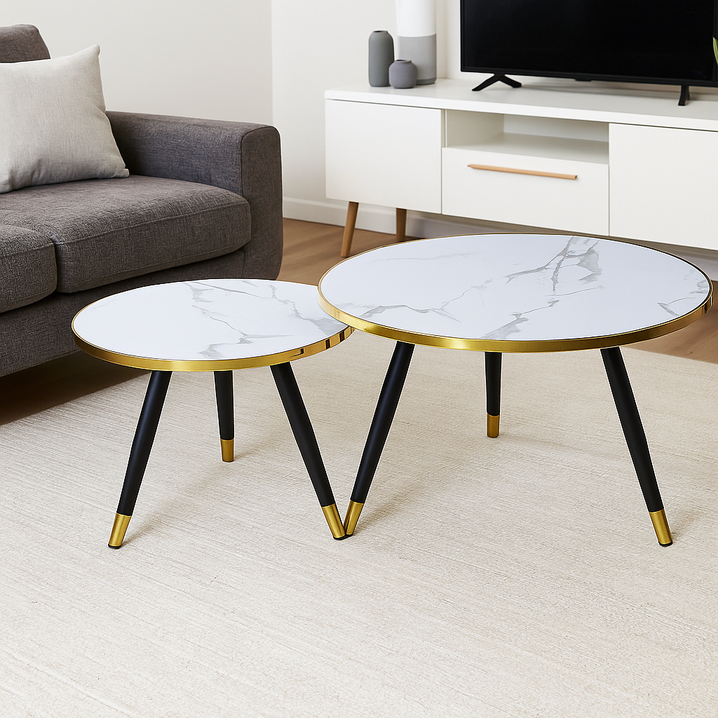 Aurelia Marble Nesting Tables – White Top with Gold Rim & Black Legs (Set of 2)