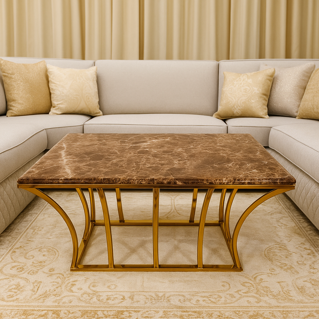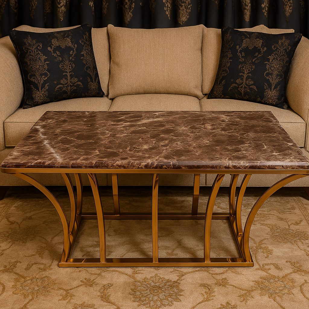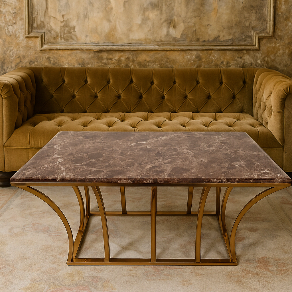 Imperial Luxe Coffee Table – Brown Marble Top with Gold Sculpted Base