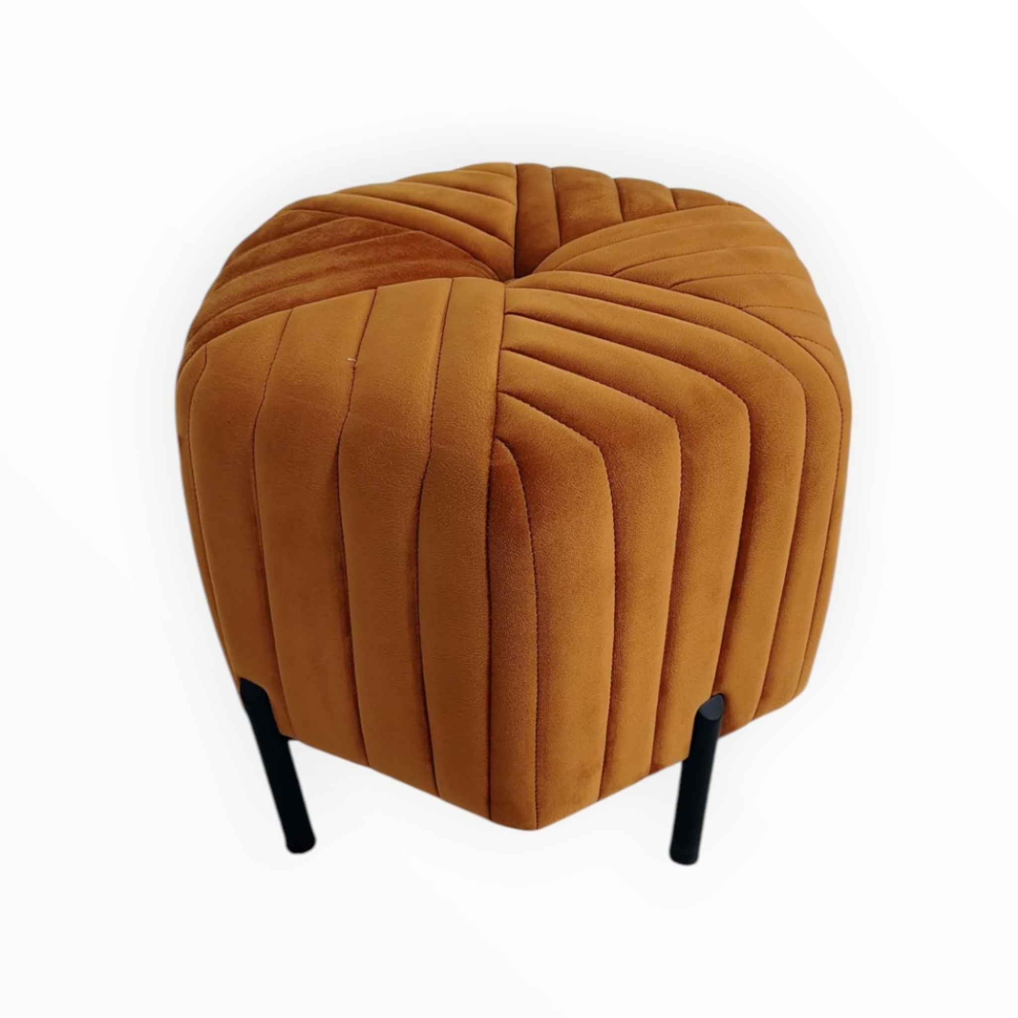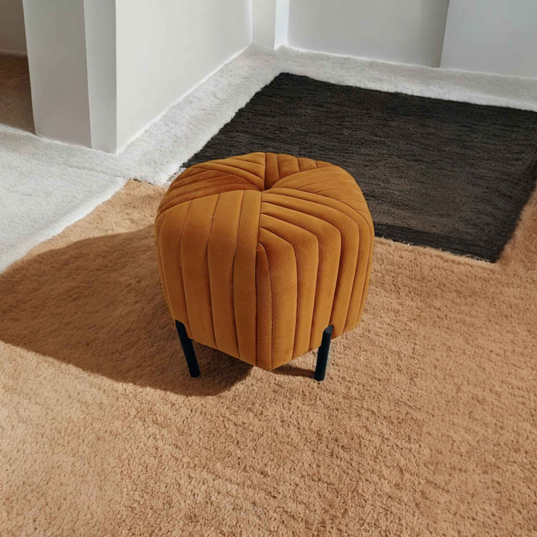 One of the standout features of this mustard yellow ottoman pouffe is its black metal legs. These legs not only provide stability and support but also create a striking contrast with the vibrant yellow fabric. The combination of different materials results in a contemporary look that complements a variety of interior styles, from mid-century modern to eclectic and minimalist designs.