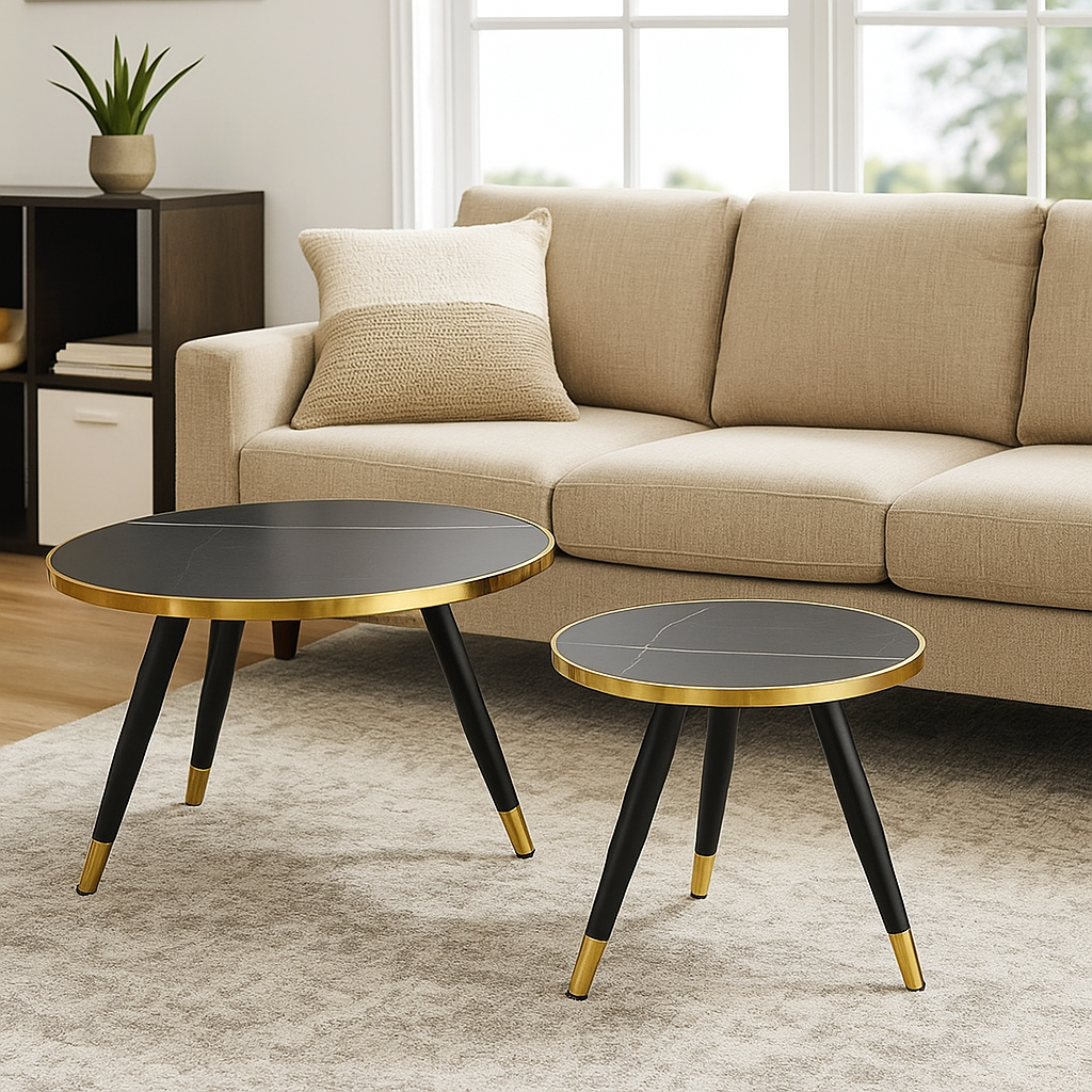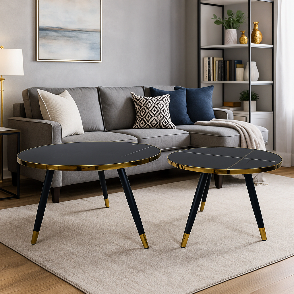 Monaco Twin Table Set – Black Marble Top with Gold Trim and Legs